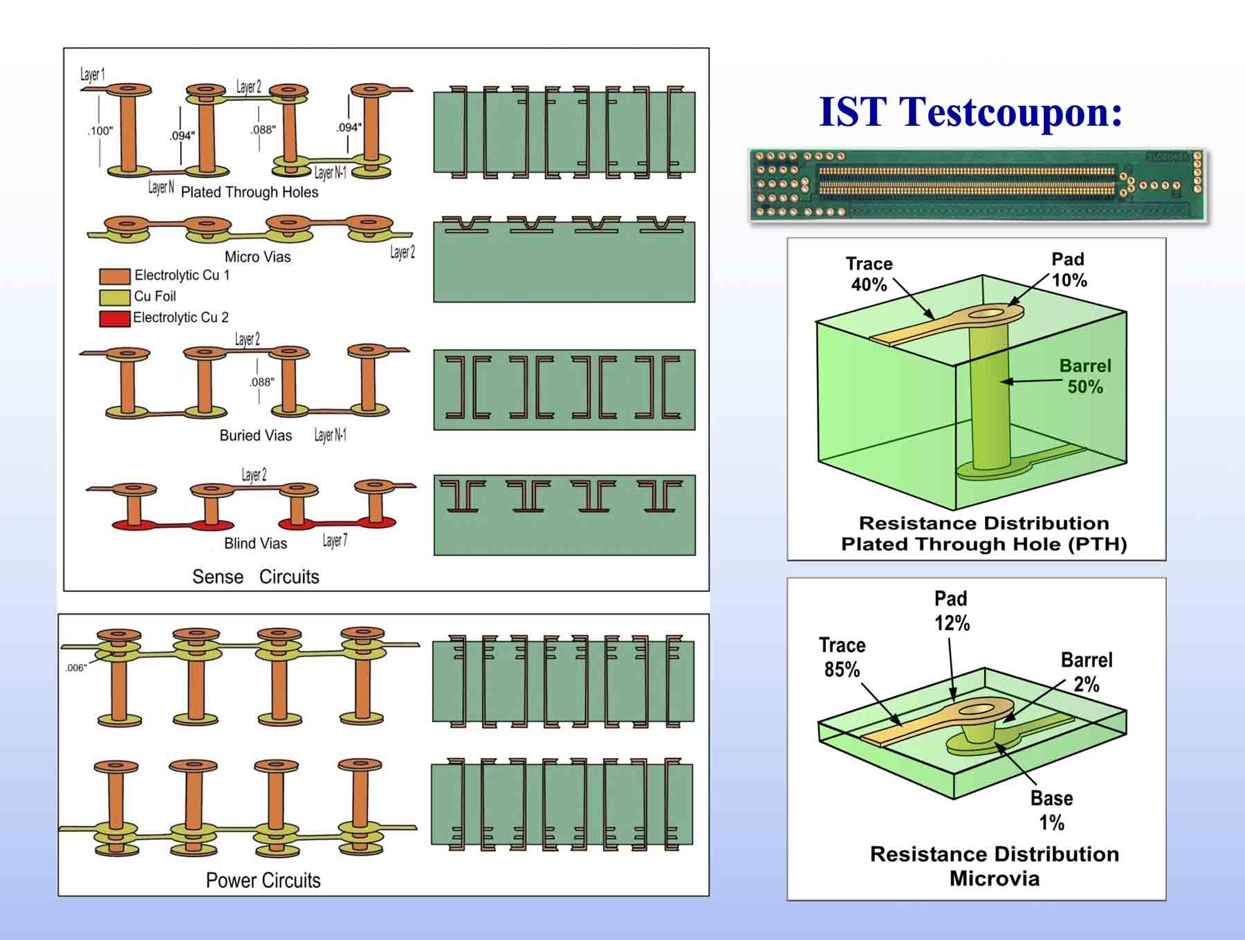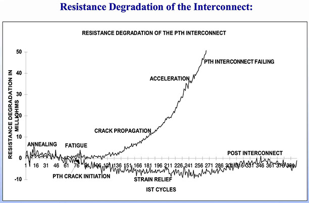 IST is an accelerated stress test method that overcomes the limitations of thermal oven or liquid/liquid methods. IST has the capability of effective/rapidly quantifying the integrity of both the Plated Through Hole (PTH) and the unique ability to identify the presence and levels of post separations within the multilayer board. The plated barrels and inner layer junctions are “exercised” until the initial failure mode/mechanism is uncovered. The data is recorded as IST cycles to failure.