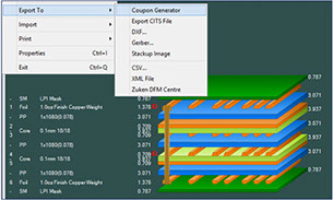 Exportieren Sie fertige Lagenaufbauten aus Speedstack und importieren diese in CGen, wählen die Prüfspitzen und die gewünschte Coupontype. CGen erzeugt dann die RS274X Gerberdaten und die Bohrdatei.