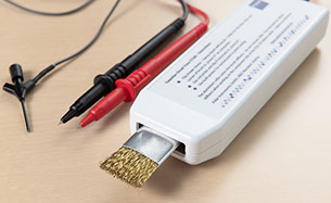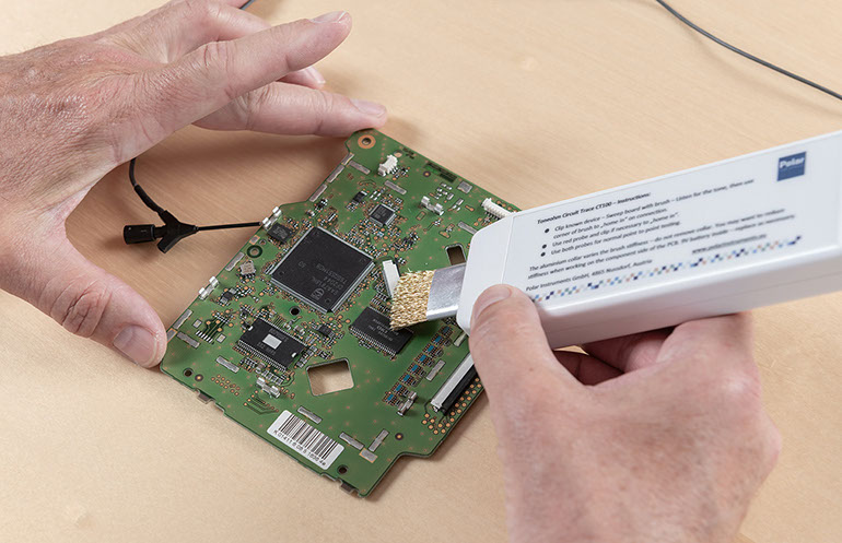To overcome this problem, a new tool is at hand: The CT100 Circuit Trace Brush combines an audible tone generator with a conductive brush in a handy instrument. A wire with a test clip is connected to the suspect net and the brush gets gently swept across the surface of the circuit board assembly, when touching a connected PCB trace, an audible tone is produced, indicating an electrical connection. Then use the edge of the brush or the red probe to home in on the connection.