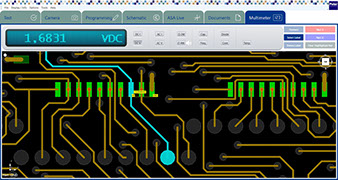 In addition to power-off nodal impedance test, the GRS200 provides an interface to an optional external Multimeter, adding measurement capabilities for voltage, resistance, frequency, temperature, etc. Measurement values may be stored for critical nets on the circuit board and compared with live measurements during the fault finding process.
