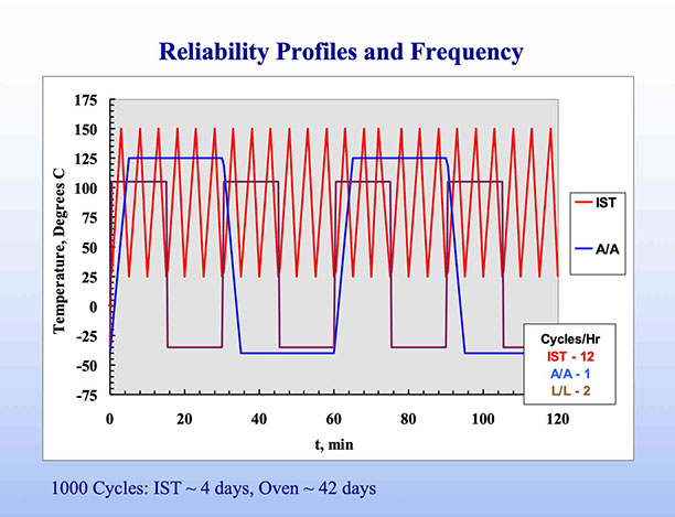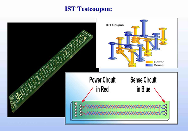 IST is an accelerated stress test method that overcomes the limitations of thermal oven or liquid/liquid methods. IST has the capability of effective/rapidly quantifying the integrity of both the Plated Through Hole (PTH) and the unique ability to identify the presence and levels of post separations within the multilayer board. The plated barrels and inner layer junctions are “exercised” until the initial failure mode/mechanism is uncovered. The data is recorded as IST cycles to failure.