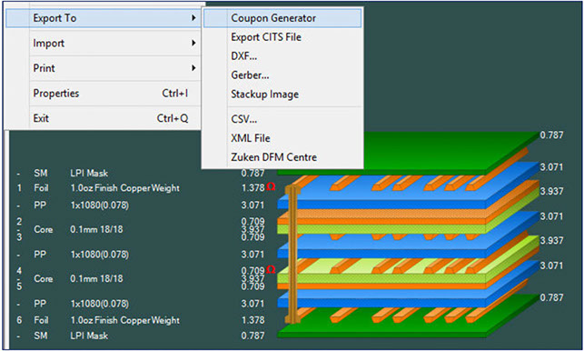 Der CGen Coupon Generator kann auch Lagenaufbauinformation direkt aus Speedstack PCB oder Speedstack Si übernehmen. CGen erzeugt automatisch den entsprechenden Impedanzcoupon, welcher alle gewünschten impedanzdefinierten Strukturen enthält. Dadurch wird dieser normalerweise sehr zeitaufwändige Prozess auf wenige Minuten reduziert.
