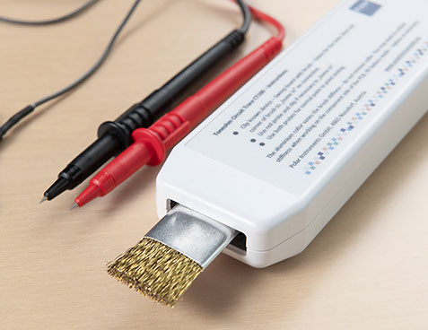 Ein neues Werkzeug schafft hier Abhilfe: Die CT100 Circuit Trace Brush kombiniert einen Tongenerator mit einer leitfähigen Bürste in einem handlichen Gehäuse. Eine Messleitung mit einem Testclip wird an die suspekte Leitung angeklemmt und die Baugruppe zunächst mit der Breitseite der Bürste sanft überstrichen. Wird ein verbundenes Leitungsnetz über die Bürste berührt, so ertönt ein akustisches Signal. Anschließend wird das verbundene Netz mit der hochkant gestellten Bürste weiter eingegrenzt und schließlich mit einer zusätzlichen Prüfspitze exakt lokalisiert.